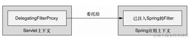 DelegatingFilterProxy是一个特殊的Servlet Filter,它本身所做的工作并不多。只是将工作委托给一个javax.servlet.Filter实现 类,这个实现类作为一个注册在Spring应用的上下文中,如图9所示:DelegatingFilterProxy把Filter的处理逻辑委托给Spring应用上下文中所定义的一个代理Filter bean
