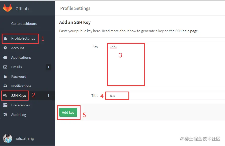 打开gitlab,找到Profile Settings-->SSH Keys--->Add SSH Key,并把上一步中复制的内容粘贴到Key所对应的文本框,在Title对应的文本框中给这个sshkey设置一个名字,点击Add key按钮