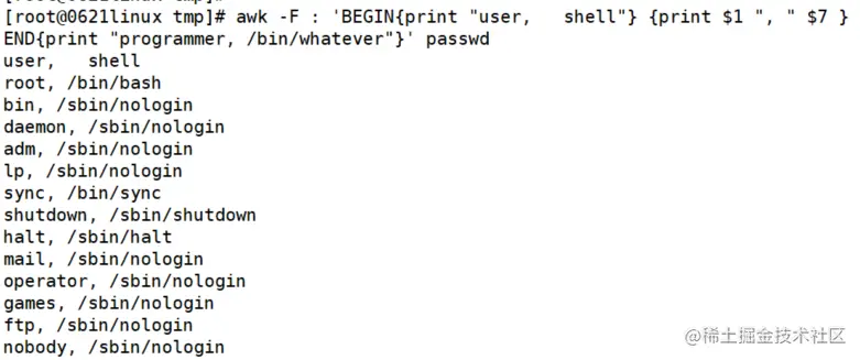 只显示/etc/passwd的第一列和第七列,以逗号分割,且 在所有行前面 添加列名"user, shell",然后 在最后一行添加"programmer, /bin/whatever":