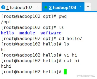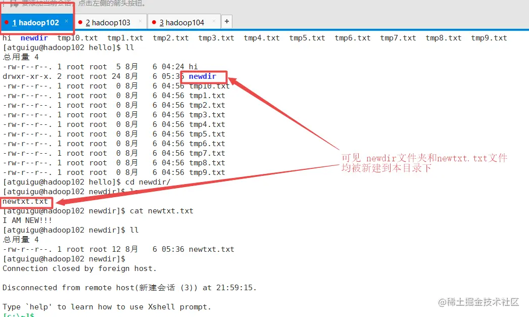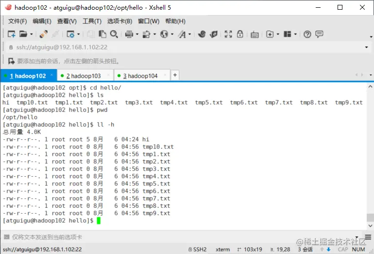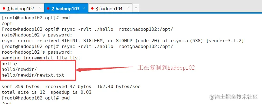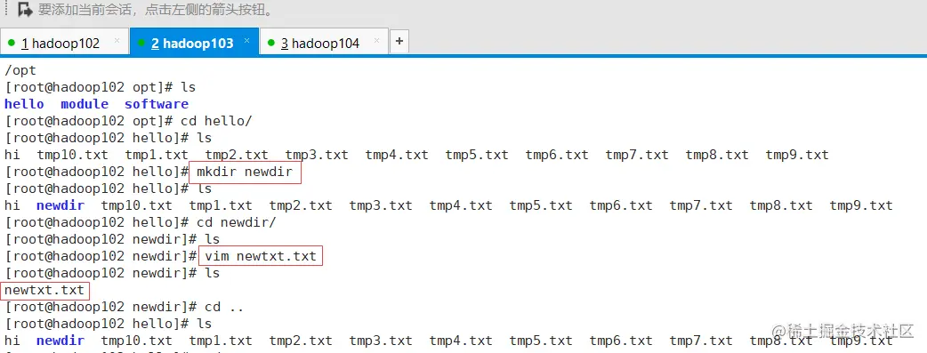 hadoop103上 /opt/hello下 新建 newdir文件夹 及 newdir/newtxt.txt文件,再把整个 /opt/hello文件夹 复制到 hadoop102上,可见只有 新建的文件夹newdir 和 文件newtxt.txt 被真正复制