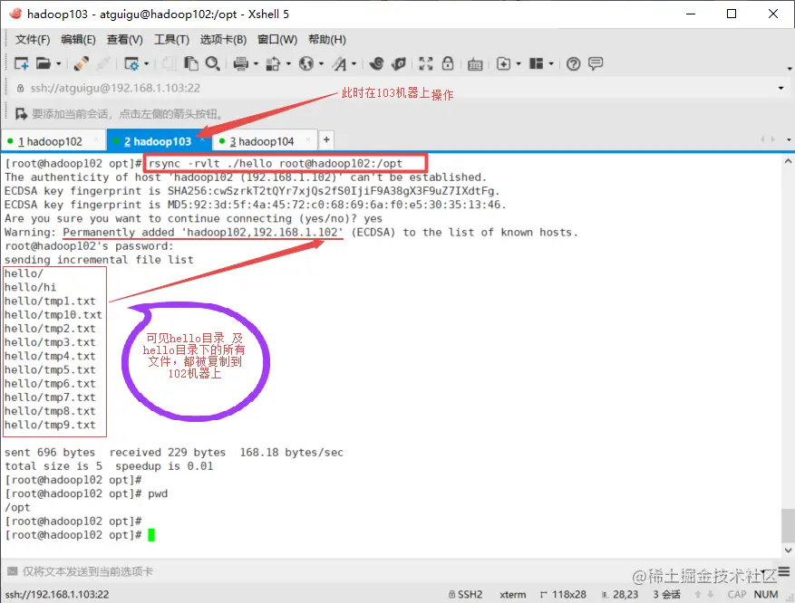 例:以本机免密方式,把 hadoop103(本机) 的 /opt/hello 文件夹及其内容, 复制到 hadoop102 的 /opt 目录下