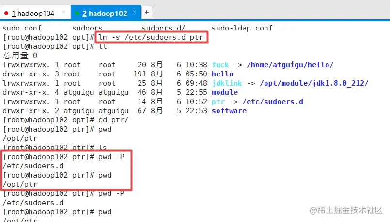 如下,可见 进入 软链接ptr 后,pwd显示ptr所在目录,pwd -P 显示ptr所指向的目录。