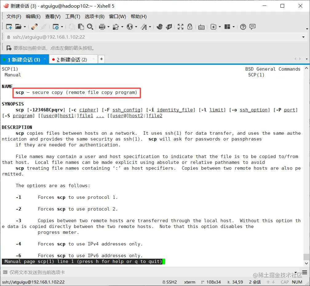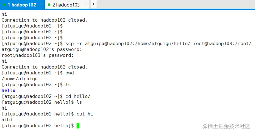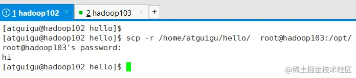 例:把 hadoop102 的 /home/atguigu/hello 文件夹及其内容, 复制到 hadoop103 的 /root 目录下