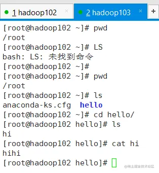 hadoop102上 观察结果,可见 hello文件夹、其内的文件 均被成功复制: