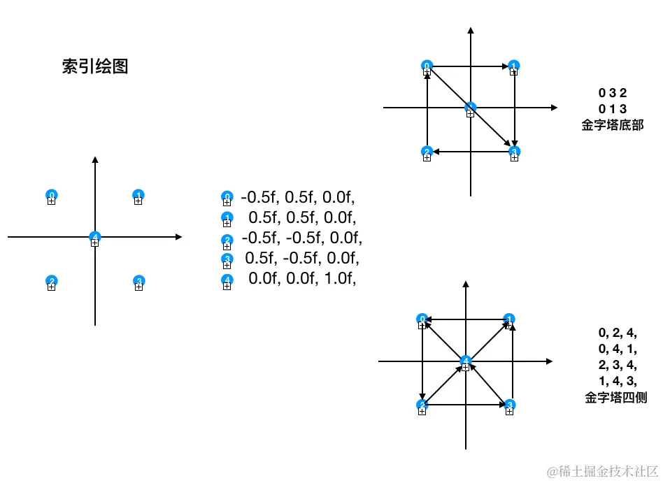 索引绘图是一种由开发者指定顶点连接顺序的绘图方式。优势是可以复用顶点,减少内存的使用。 如绘制一个金字塔3D图形时,如果使用三角形带或三角形组合绘制时,将会有多个顶点的重复,但如果使用索引绘图,则只需要5个点,重复利用,指定其连接顺序即可实现金字塔3D图形的绘制。