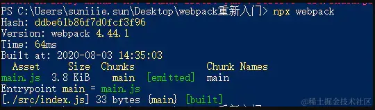注释: 有点同学会直接用webpack开头执行命令出现报错,是因为需要将webpack全局安装,但是不建议全局安装,因为版本不同,可能有些功能就不支持,这里的npx是npm下面的一个分支,因为npm是全局安装,故npx不会报错。