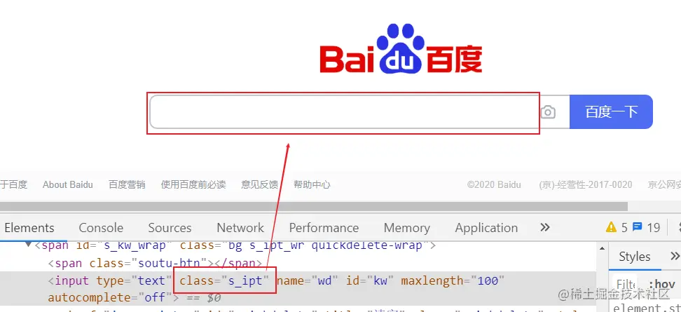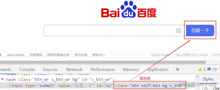 class属性存在复合类:以下这段class属性就是一个复合类,每个类用空格分隔,如果通过全匹配定位,程序会报错# 以下程序会报错 driver = webdriver.Chrome() # 调用 Chrome 浏览器 driver.get('https://www.baidu.com') # 打开百度网站 kw_element = driver.find_element_by_class_name("btn self-btn bg s_btn") # 通过 class 属性定位搜索按钮 kw_element.click() # 点击搜索按钮 sleep(5) # 强制休眠 5 秒 driver.quit() # 关闭浏览器 # 报错信息 # selenium.common.exceptions.NoSuchElementException: # Message: no such element: Unable to locate element: # {"method":"css selector","selector":".btn self-btn bg s_btn"}