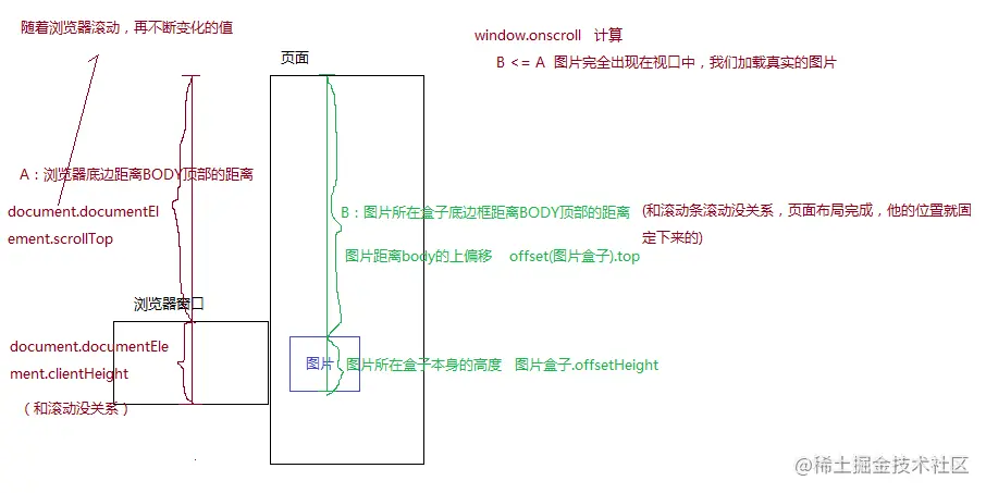 // 延迟加载的条件:图片完全出现在可视窗口中(B<=A)
