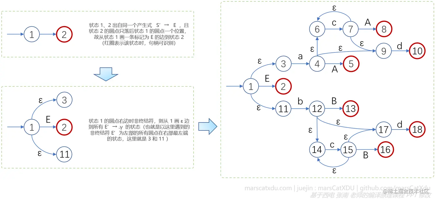 若状态 i 圆点后面是非终结符,比如 i:X → α.Aβ,则从 i 画 ε 边到所有 A → .γ 的状态