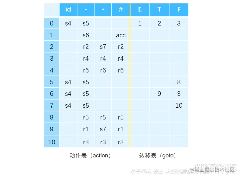 分析表分为两个部分,分别是【动作表(Action)】和【转移表(goto)】。