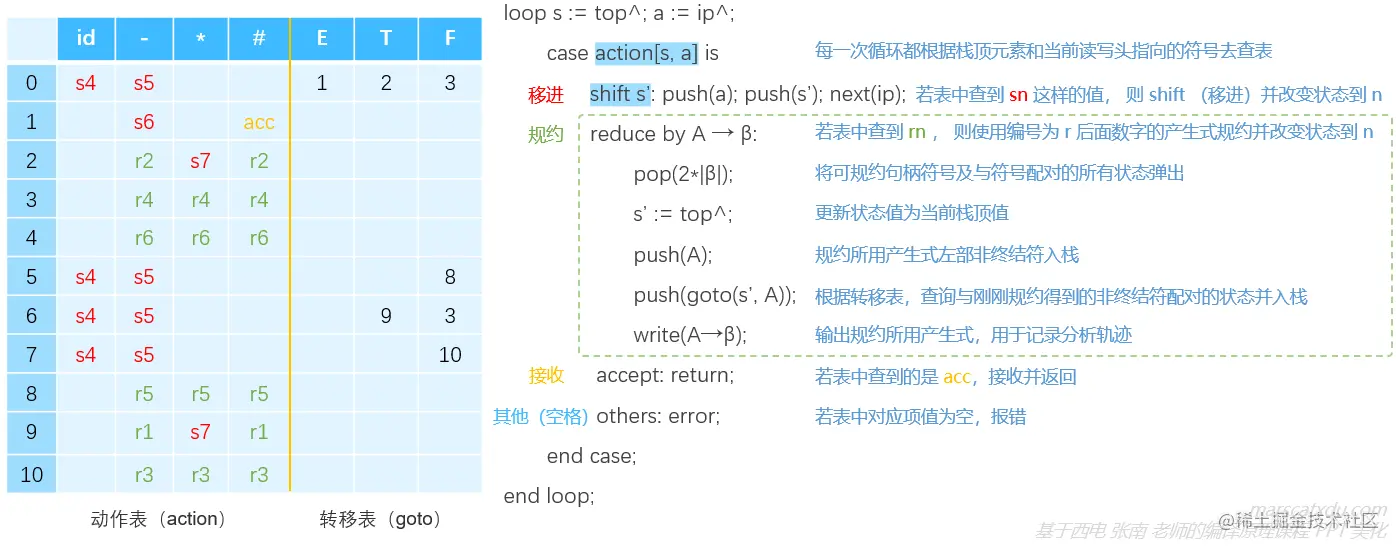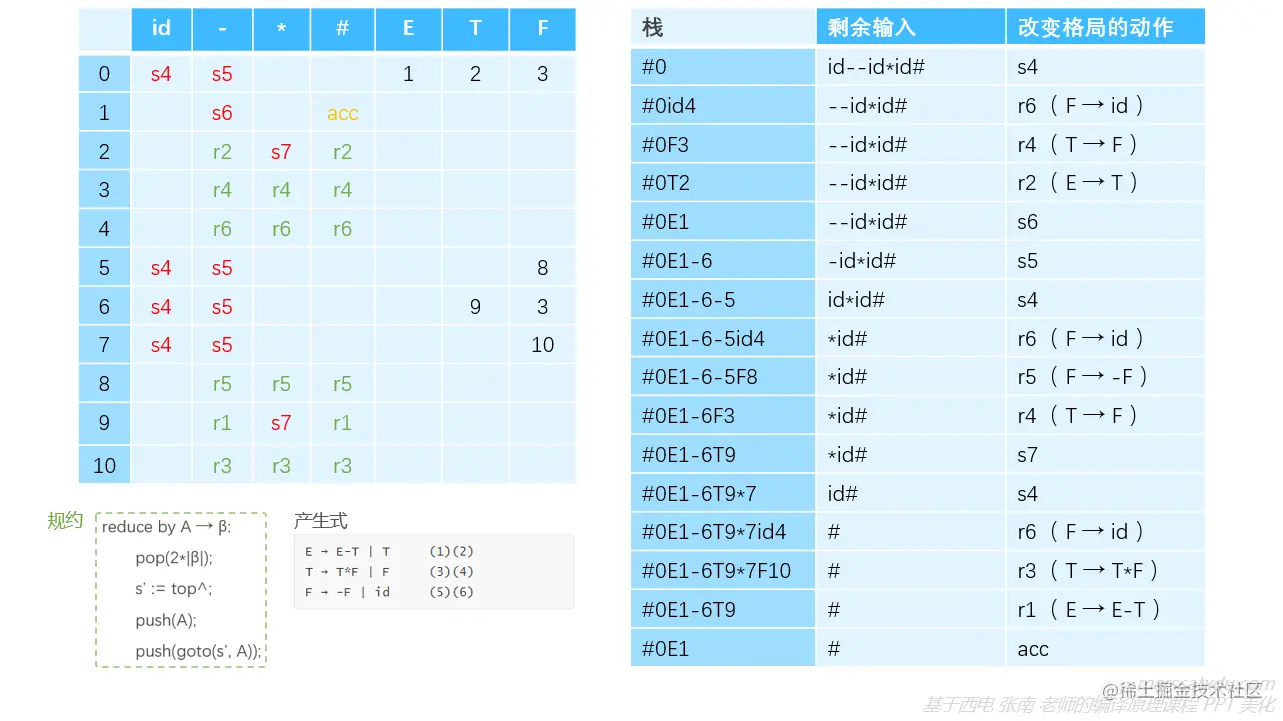 - 接收(acc):当前栈顶状态编号为 1 ,剩余输入序列中读到 # ,故根据查表可知这个 action[s, 1] 对应着动作表中的 acc ,也就是要执行 acc 这个改变格局的动作了。