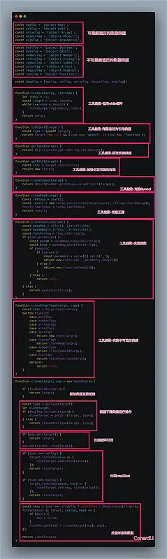上面我们已经考虑的object、array都属于可以继续遍历的类型,因为它们内存都还可以存储其他数据类型的数据,另外还有Map,Set等都是可以继续遍历的类型,这里我们只考虑这四种,