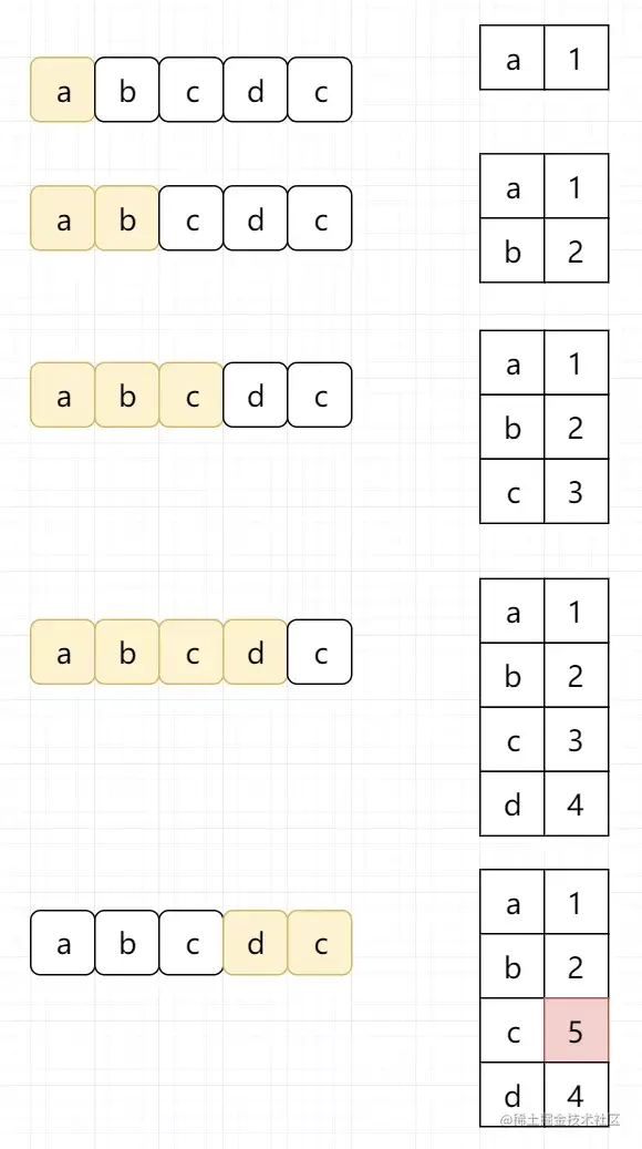 假设我们的字符串为“abcdc”,对于abc我们都访问了2次。