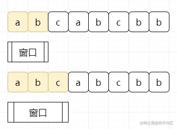 当下一个元素在窗口没有出现过时,我们扩大窗口。