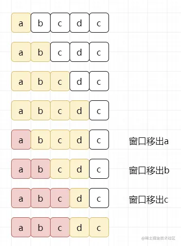 当下一个元素在窗口中出现过时,我们缩小窗口,将出现过的元素以及其左边的元素统统移出: