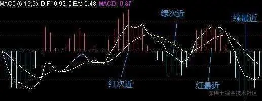 当绿最近非常小(甚至于没有绿柱),远远小于绿次近时(卖方没有那么大的力量了),做空力量往往会转化为做多,即为彻底底背离;