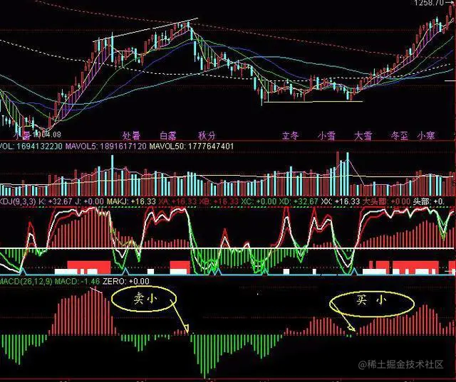 MACD卖小 ——股价上涨、而后一波红柱没有前一波高、将下跌。