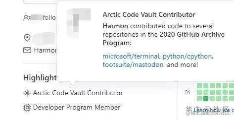 GitHub官方为这些将自己代码上传至北极代码库 的开发者们还设计了 荣誉徽章 以示表彰,只要将鼠标悬停在开 发者主页 资料介绍中“ Highlight ”的下方,即可看到该开发者有哪些项目存在于北极代码库。