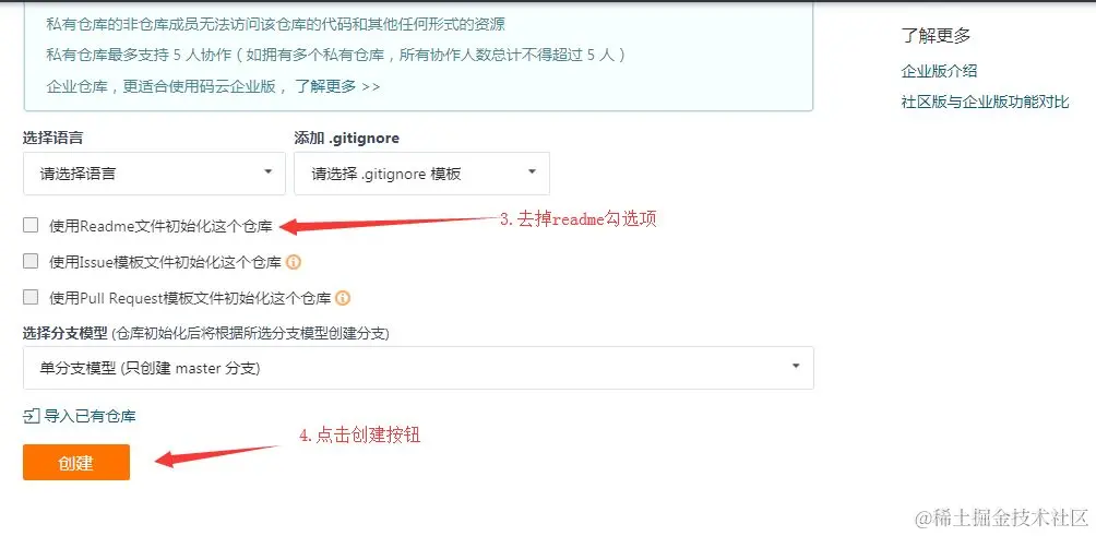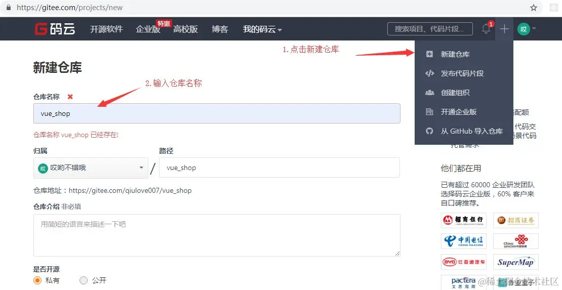 点击码云右上角的+号->新建仓库