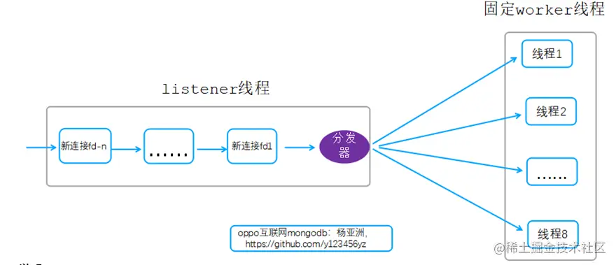 listener线程每接收到一个新的客户端链接产生一个新的fd,然后通过分发器发送给对应的工作线程(hash方式)