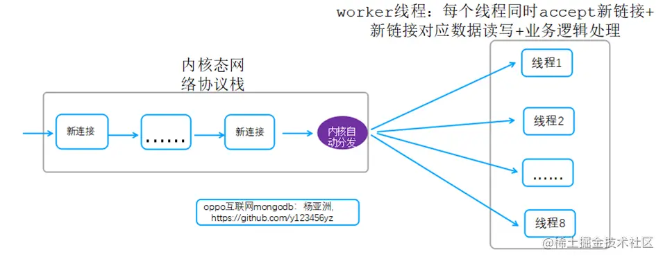 Linux kernel 3.9开始支持reuseport功能,内核协议栈每获取到一个新链接自动均衡分发给用户态worker线程。