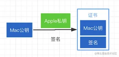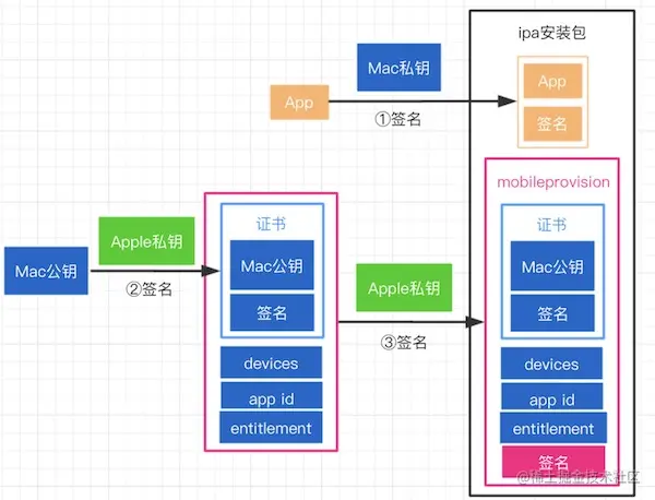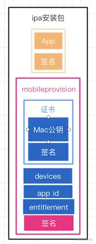 - 第二步,签名验证成功之后,拿到mobileprovision中存放的devices、app id以及entitlement信息。同时拿到证书文件。然后使用Apple公钥对证书中的签名进行验证。验证成功之后拿到Mac公钥。