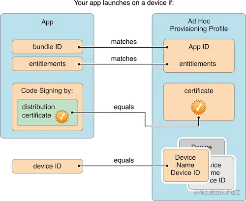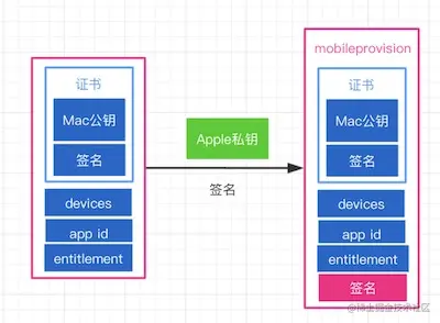 - 第三步,生成mobileprovision,此步骤就是将devices、app id、entitlement和证书文件,通过Apple私钥进行签名,生成最后的mobileprovision文件。而且生成的mobileprovision文件就决定了当前App可以安装的设备有哪些,可以安装的App的BundleId,以及App所拥有的权限。