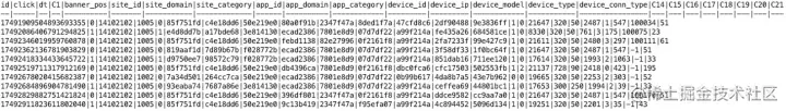 这里使用Kaggle比赛的CTR数据,链接为:www.kaggle.com/c/avazu-ctr… 。由于是压缩数据,需要下载到本地,为了演示方便,我们直接使用oss上存储的一份采样数据。使用TextSourceBatchOp整行读取打印部分数据,脚本如下: