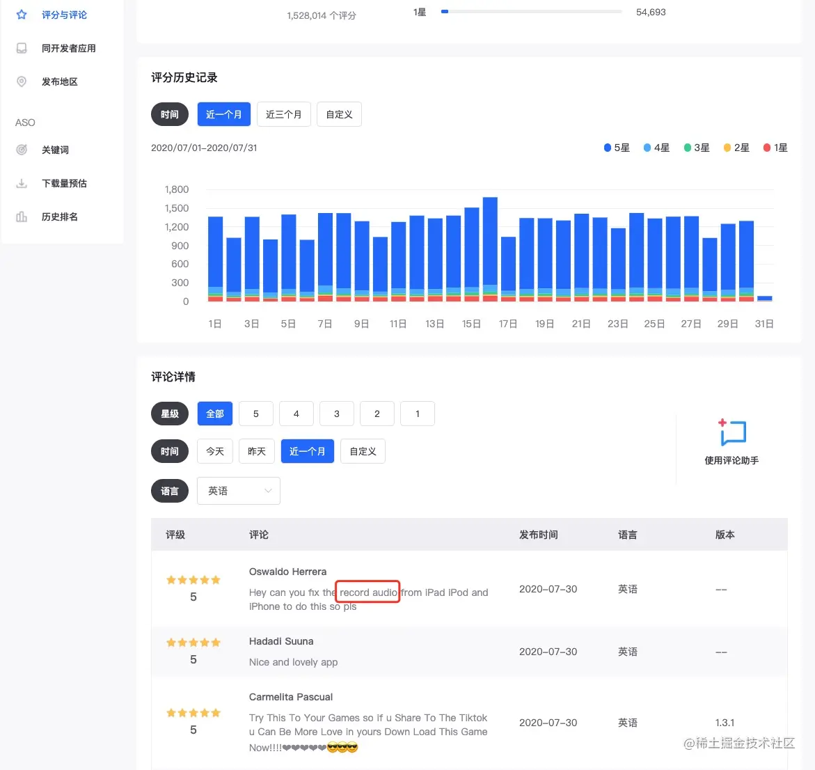 竞品的描述和评论区可以给你很多灵感,最好覆盖他们的大部分关键词,然后再补充一些自己的词。如果想查看每个竞品覆盖的关键词,可以用EVA数据的关键词工具。评论也是关键词的重要来源,如果是新应用,可以看看竞品的评论区,用户都是怎么描述这个App的。应用上架之后需要追踪一下自家App的用户评论。查看评论也可以用EVA数据。