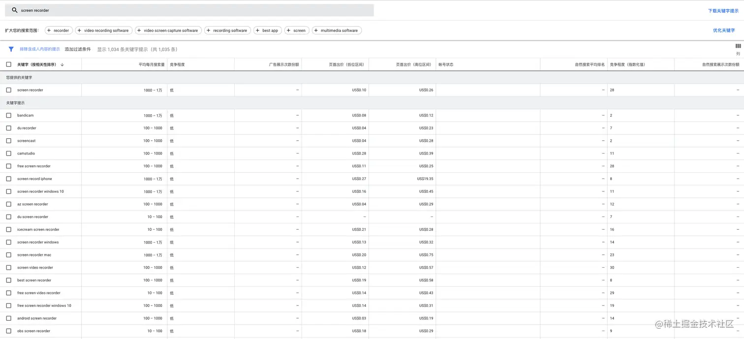 搜索量可以通过Google AdWords的关键词规划师查看。按理来说当然是搜索量越大的词越好,但是作为一个新应用,你是玩不过头部应用的,我们也需要结合竞争难度去选择。