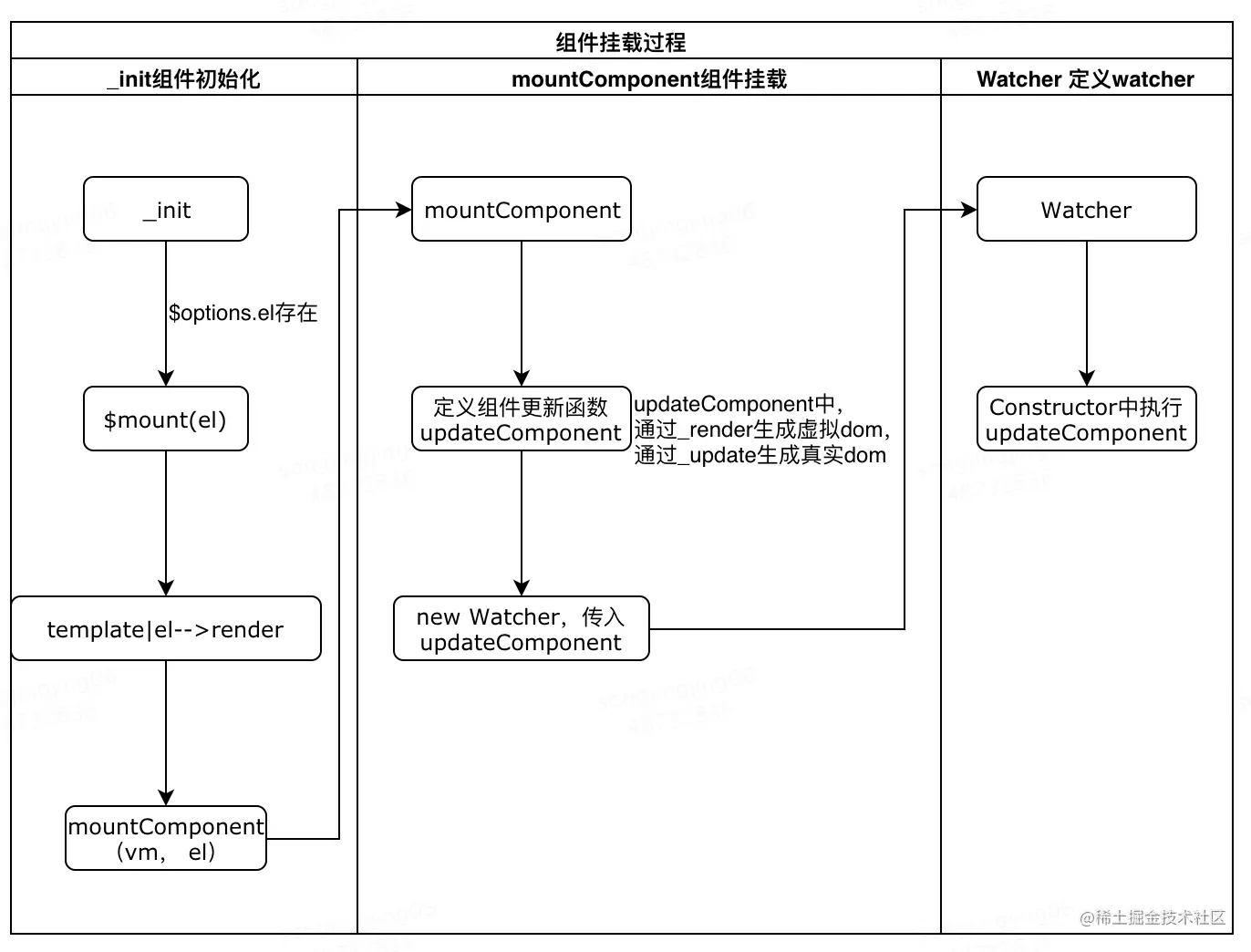 在组件更新函数中,先通过_render将render的模板编译结果转为虚拟dom,然后通过_update将虚拟dom转为真实dom。创建watcher实例,将组件更新函数作为参数传递;在watcher的constructor中执行组件更新函数,实现组件的挂载
