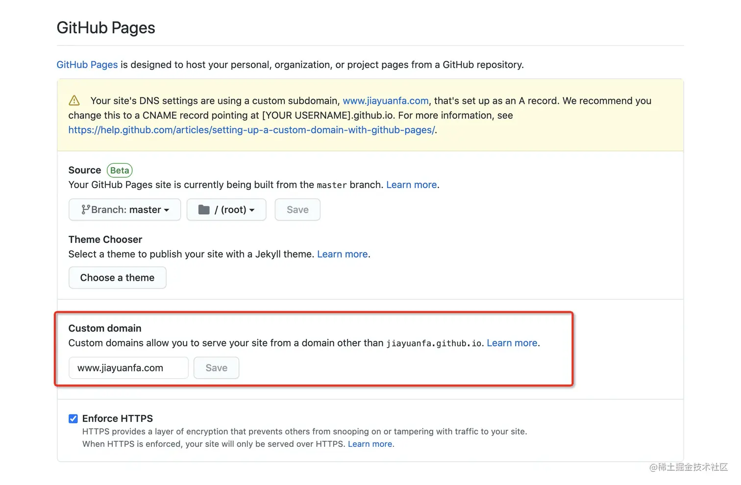 - 然后,去github的博客仓库的设置里面也填写自己的域名