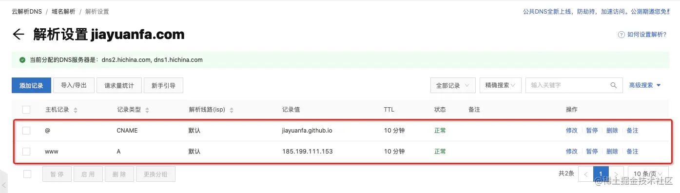 - 添加两种记录即可,一种是CNAME类型的,用来关联其他域名,一种是IP映射的