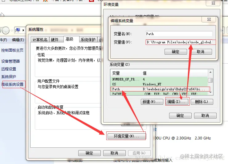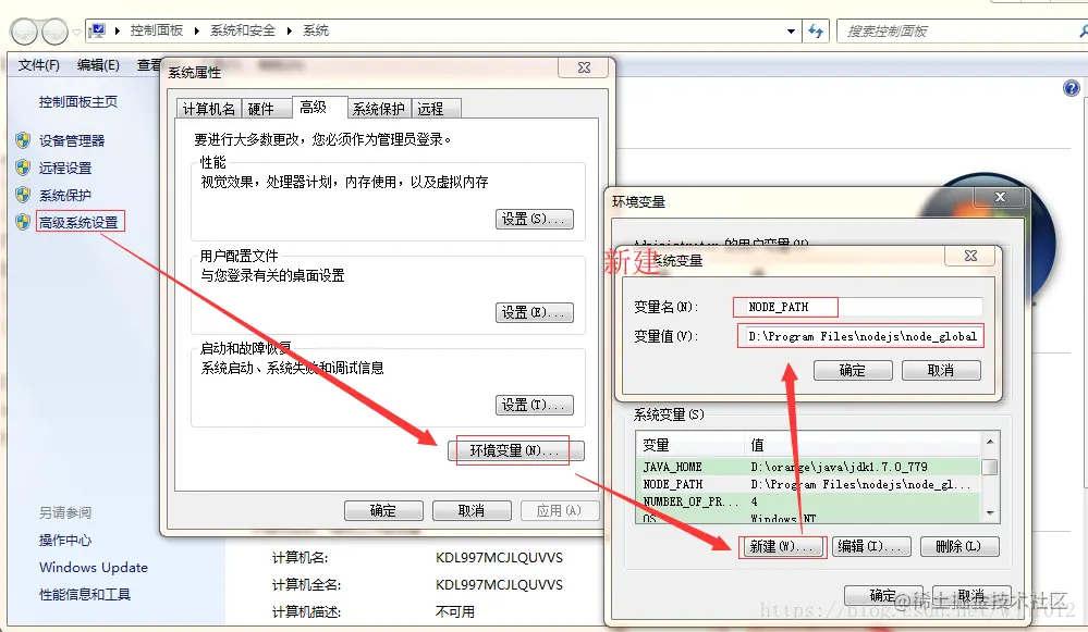 操作如下:**我的电脑右击,打开属性->高级系统设置->环境变量->新建(系统变量下)->输入变量名NODE_PATH->变量值:**输入上面路径,确定即可。