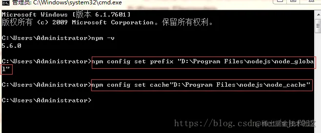 - 首先配置npm的全局模块的存放路径、cache的路径,此处我选择放在:D:\Program Files\nodejs 输入如下命令: