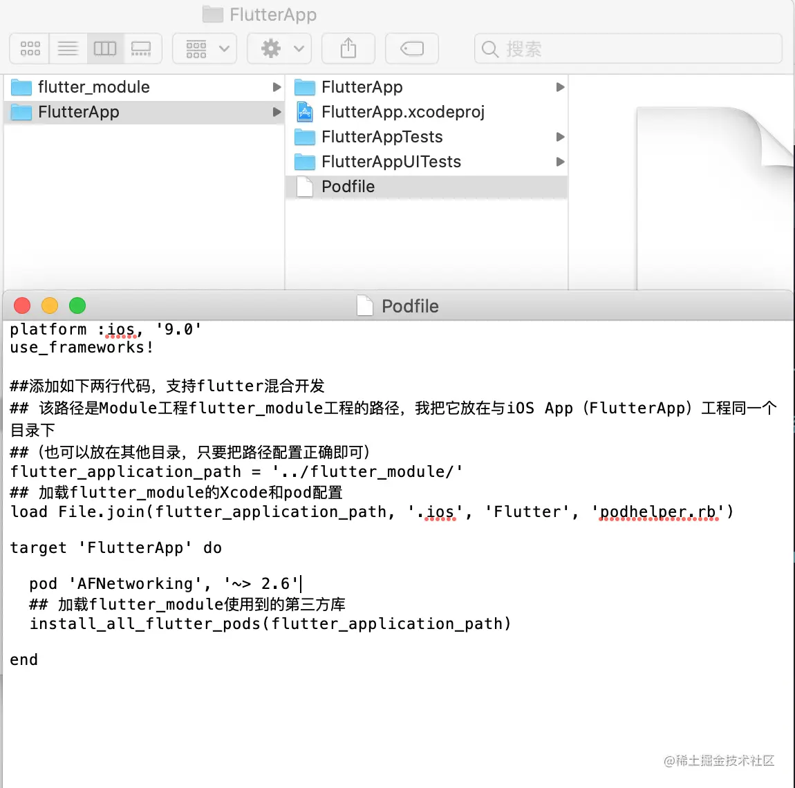 platform :ios, '9.0' use_frameworks! ##添加如下两行代码,支持flutter混合开发 ## 该路径是Module工程flutter_module工程的路径,我把它放在与iOS App(FlutterApp)工程同一个目录下 ##(也可以放在其他目录,只要把路径配置正确即可) flutter_application_path = '../flutter_module/' ## 加载flutter_module的Xcode和pod配置 load File.join(flutter_application_path, '.ios', 'Flutter', 'podhelper.rb') target 'FlutterApp' do pod 'AFNetworking', '~> 2.6' ## 加载flutter_module使用到的第三方库 install_all_flutter_pods(flutter_application_path) end