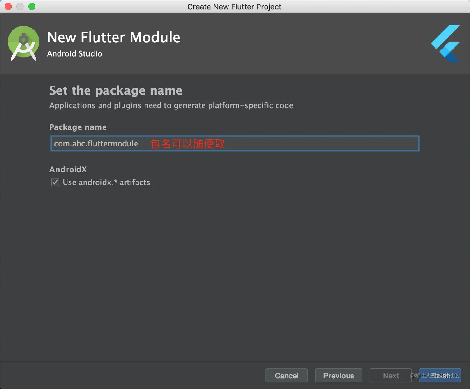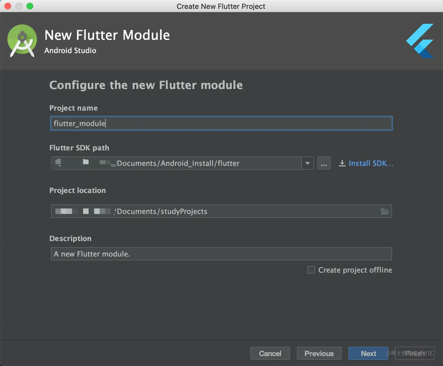 使用Android Studio新建一个Flutter Module工程,暂且命名为flutter_module。(或者使用命令行新建一个Flutter Module工程)