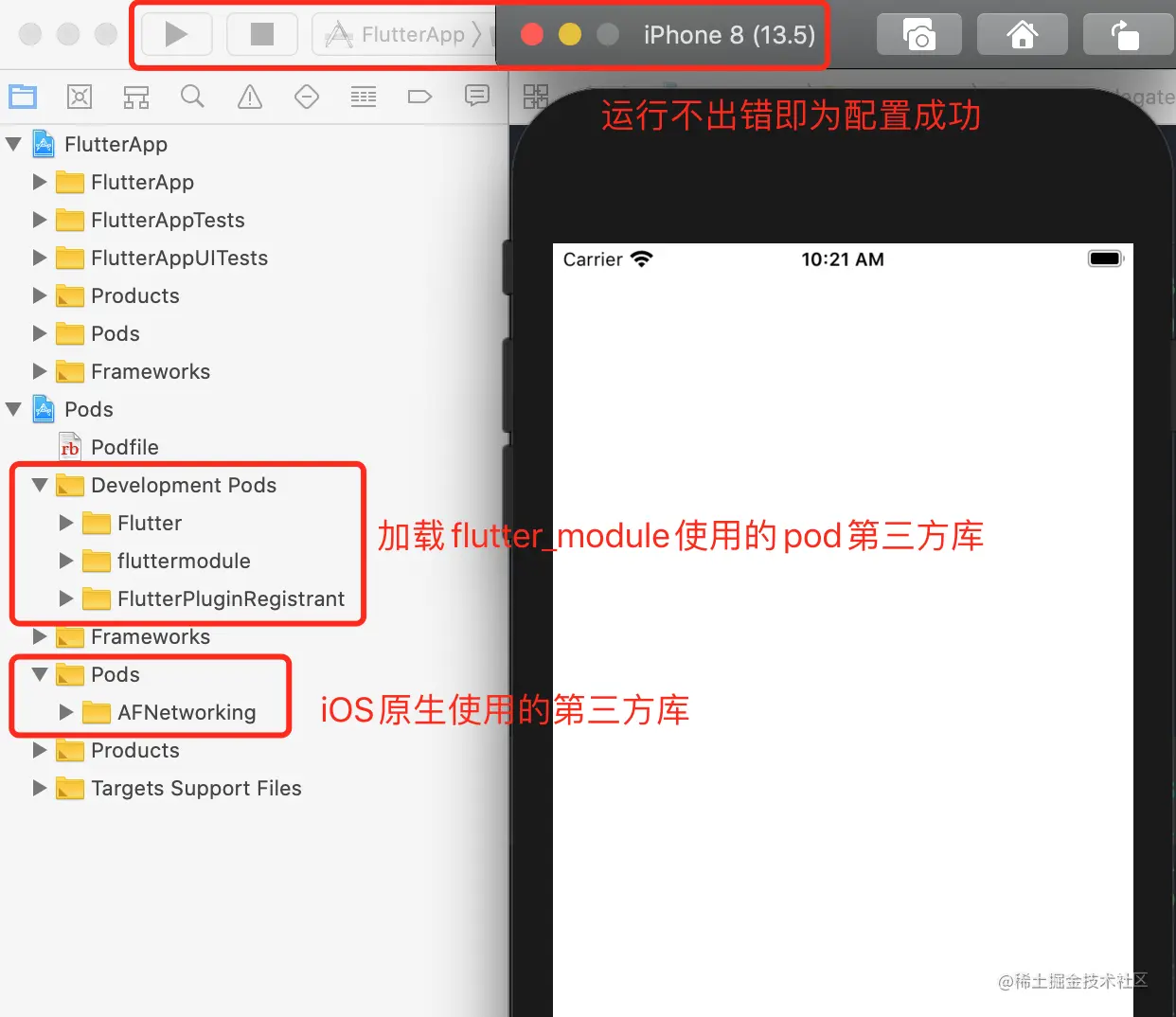 使用Xcode打开FlutterApp.xcworkspace工程,运行项目,此时混合环境已经配置完成。