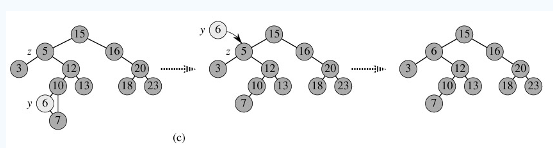 p的左子树和右子树均不空。找到p的后继y,因为y一定没有左子树,所以可以删除y,并让y的父亲节点成为y的右子树的父亲节点,并用y的值代替p的值;或者方法二是找到p的前驱x,x一定没有右子树,所以可以删除x,并让x的父亲节点成为y的左子树的父亲节点。如图c。