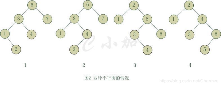 对于一个平衡的节点,由于任意节点最多有两个儿子,因此高度不平衡时,此节点的两颗子树的高度差2.容易看出,这种不平衡出现在下面四种情况: