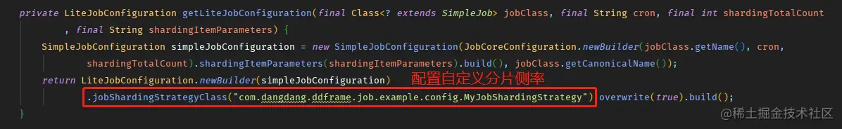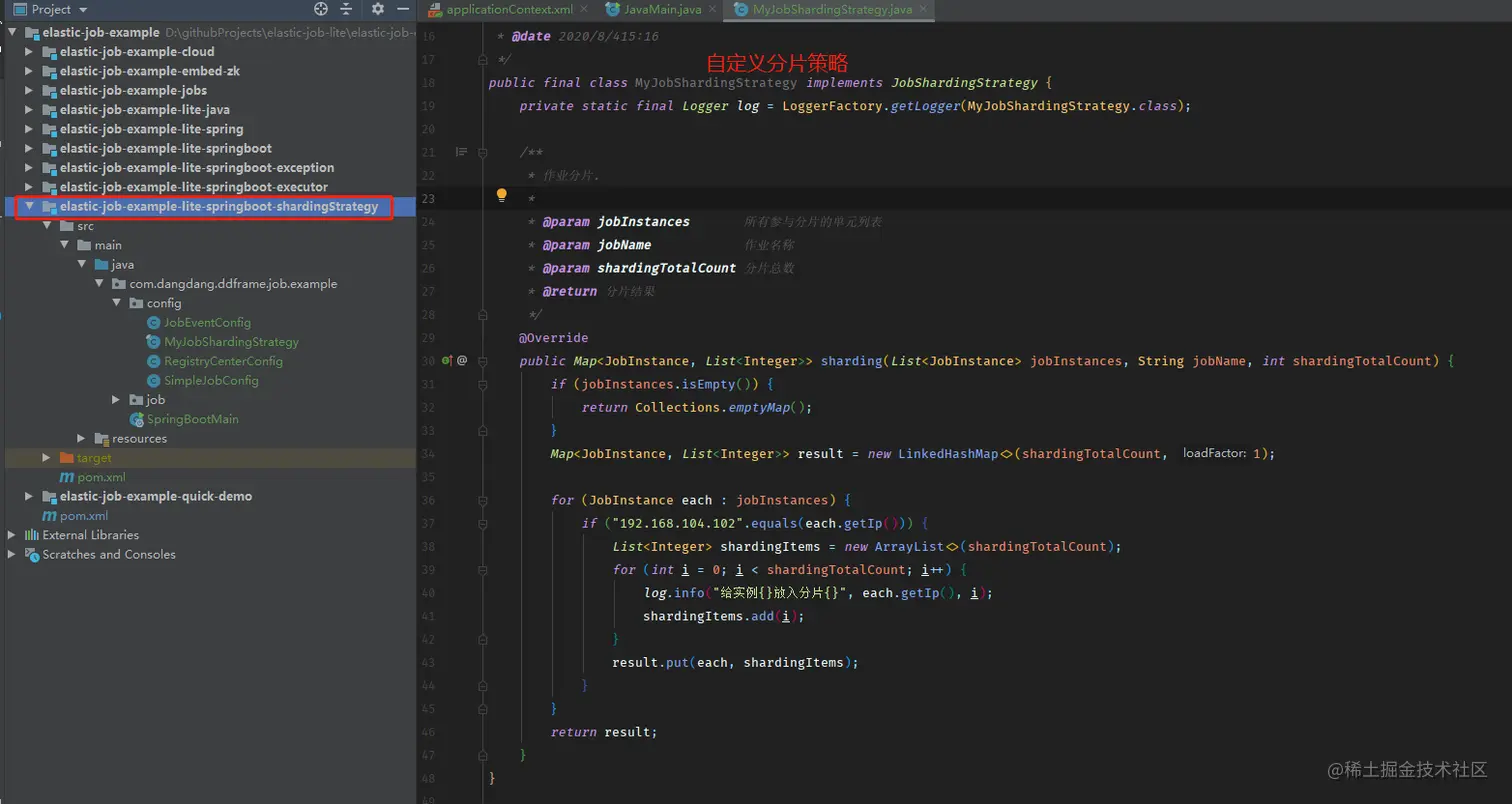 实现JobShardingStrateg接口并实现sharding方法即可,可以根据需求定制化自己的分片策略。与配置通常的作业属性相同,在spring命名空间或者JobConfiguration中配置jobShardingStrategyClass属性,属性值是作业分片策略类的全路径。