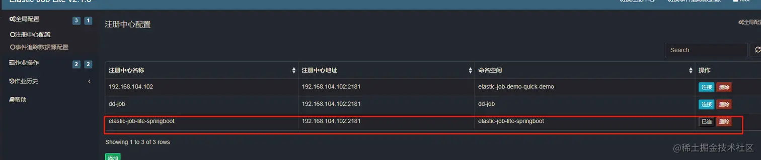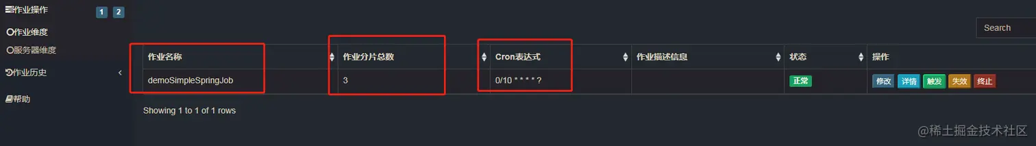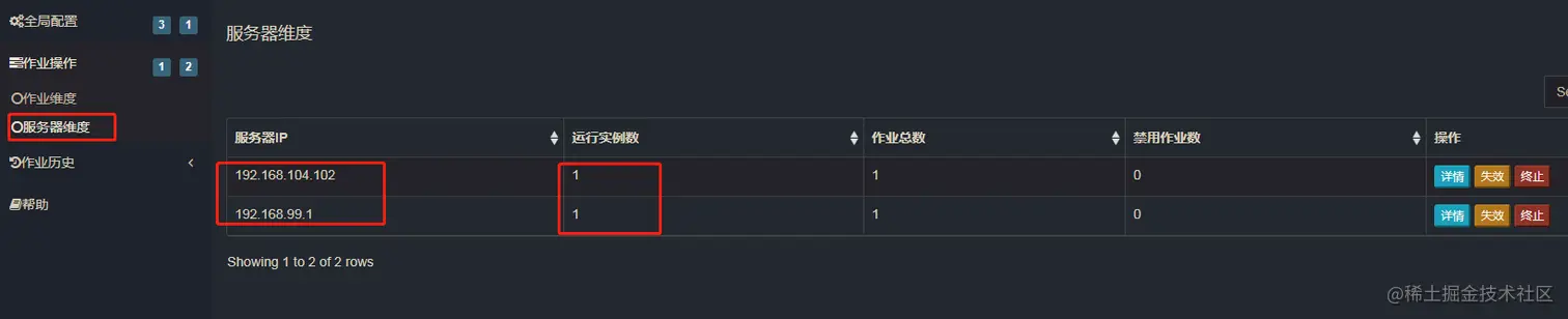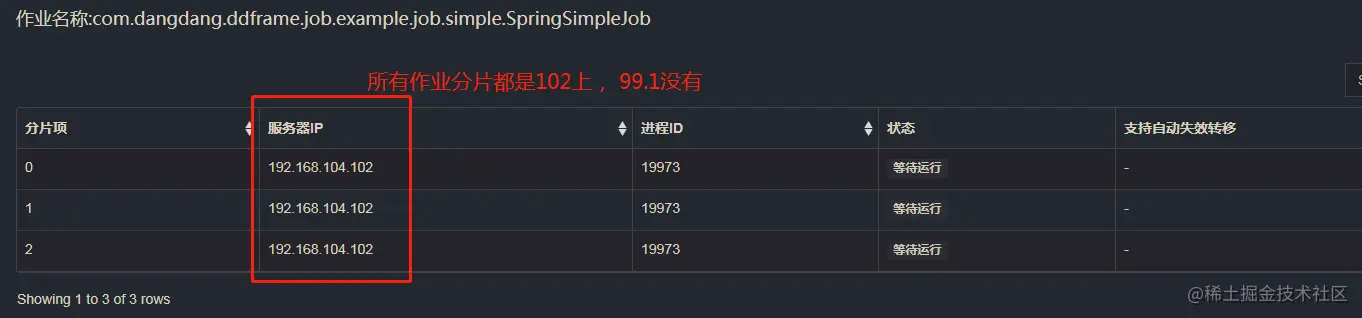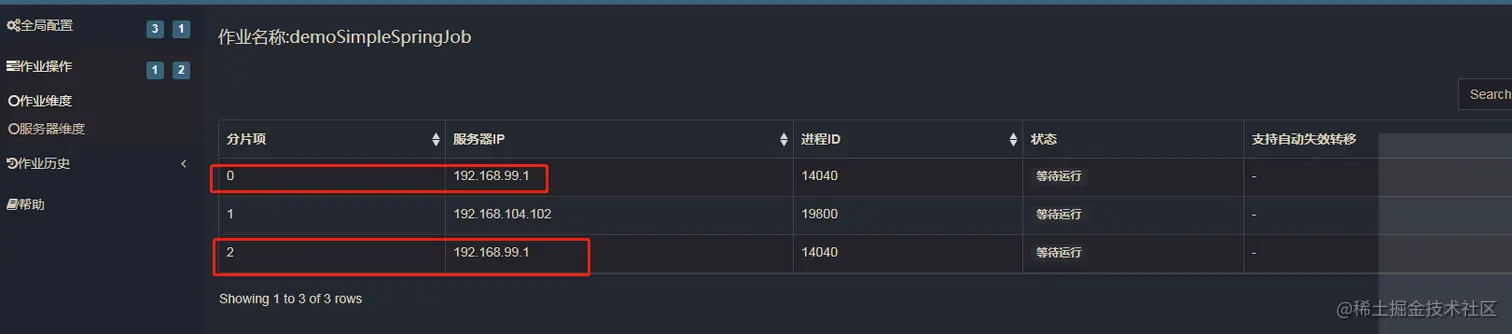 那么服务器和作业分片是什么样的关系了, 回顾上下文可以了解到, 作业的分片数是3, 机器实例是2台,默认的分片策略是AverageAllocationJobShardingStrategy,所以通过运维平台查看作业详情如下, 和AverageAllocationJobShardingStrategy的策略描述是相符合的。