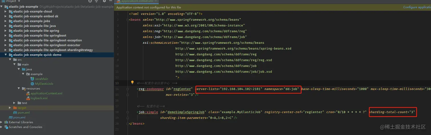 回到熟练使用 Elastic Job系列之入门Demo(三) 文章的实例demo, 在项目中有通过sharding-total-count=来设置作业分片数, 如图所示,