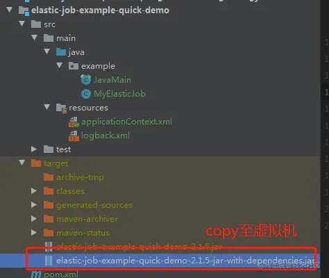 从配置中可以知道zookeeper注册中心地址,名称空间, 以及作业的分片数目。在这里为了模拟多机器部署,先对工程进行maven打包, 然后在本机启动项目,同时把打的jar包丢到虚拟机里执行