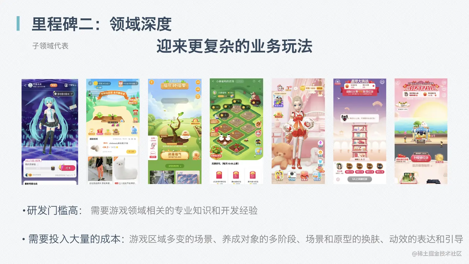 - 第二个难题:需要投入大量的成本,游戏区域多变的场景、养成对象的多阶段、场景和原型的换肤、动效的表达和引导,都会增加开发工作量。