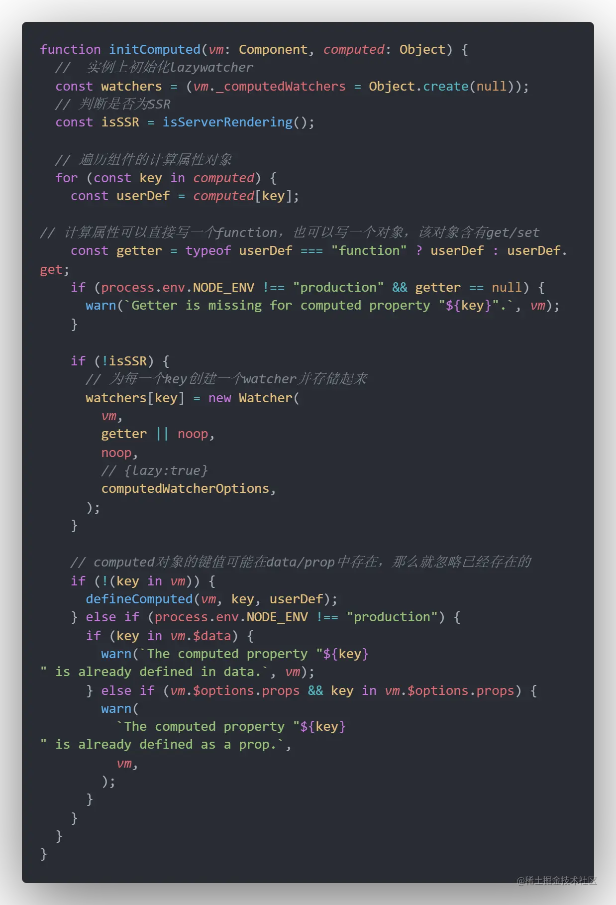 对computed对象内的键值进行初始化处理,如果键值在data/prop内出现过就忽略,如果没有出现过就对其创建相应的watcher,并且设置lazy为true。