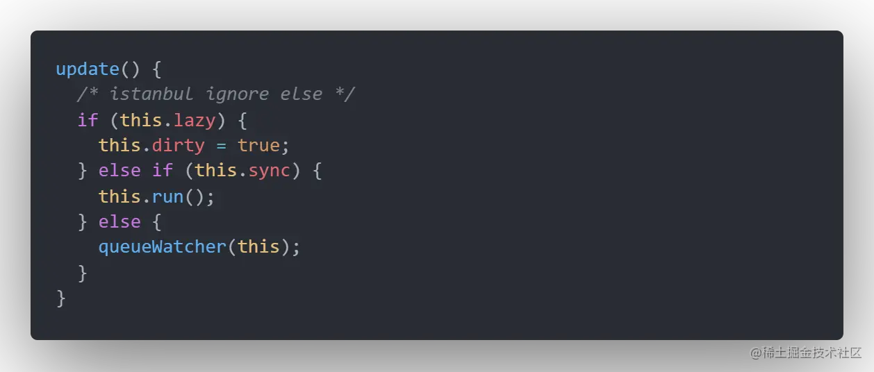 在依赖的属性有进行更新的时候,会触发当前lazywatcher的update方法,将dirty设置为true,也就说下次取值的