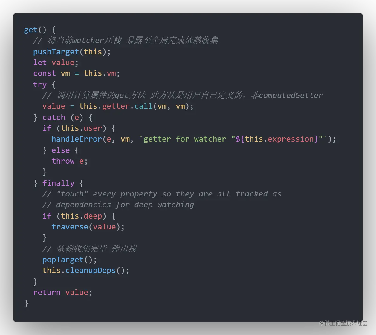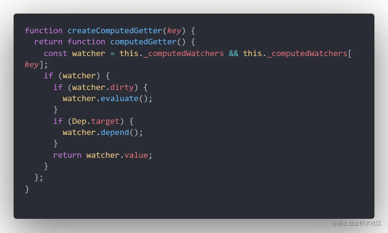 上面提到了缓存计算结果。那么知道了如何得到watcher.value就知道了计算属性的缓存策略。