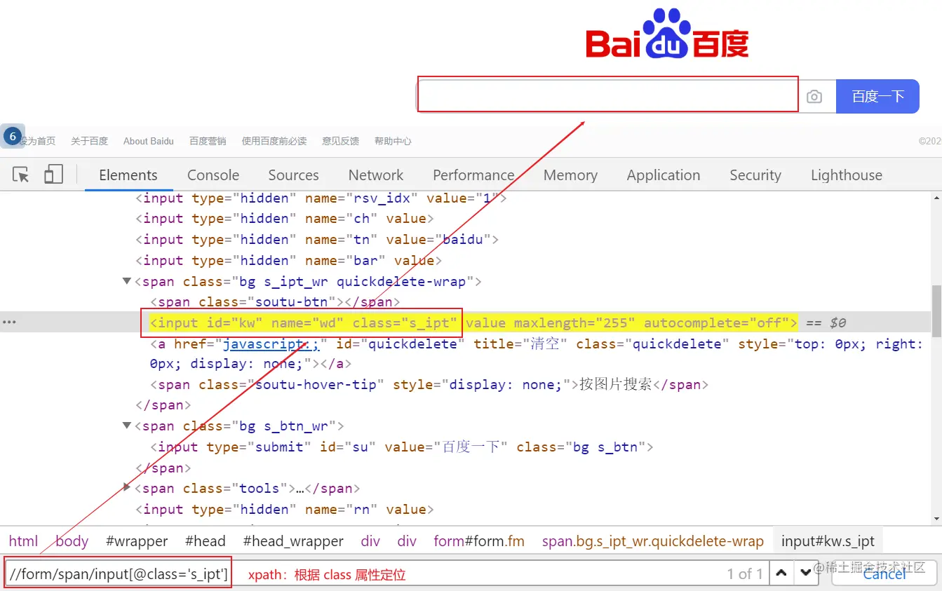 # element = driver.find_element_by_xpath("//div/form/span/input[@class='s_ipt']") # 根据 id 属性 定位元素