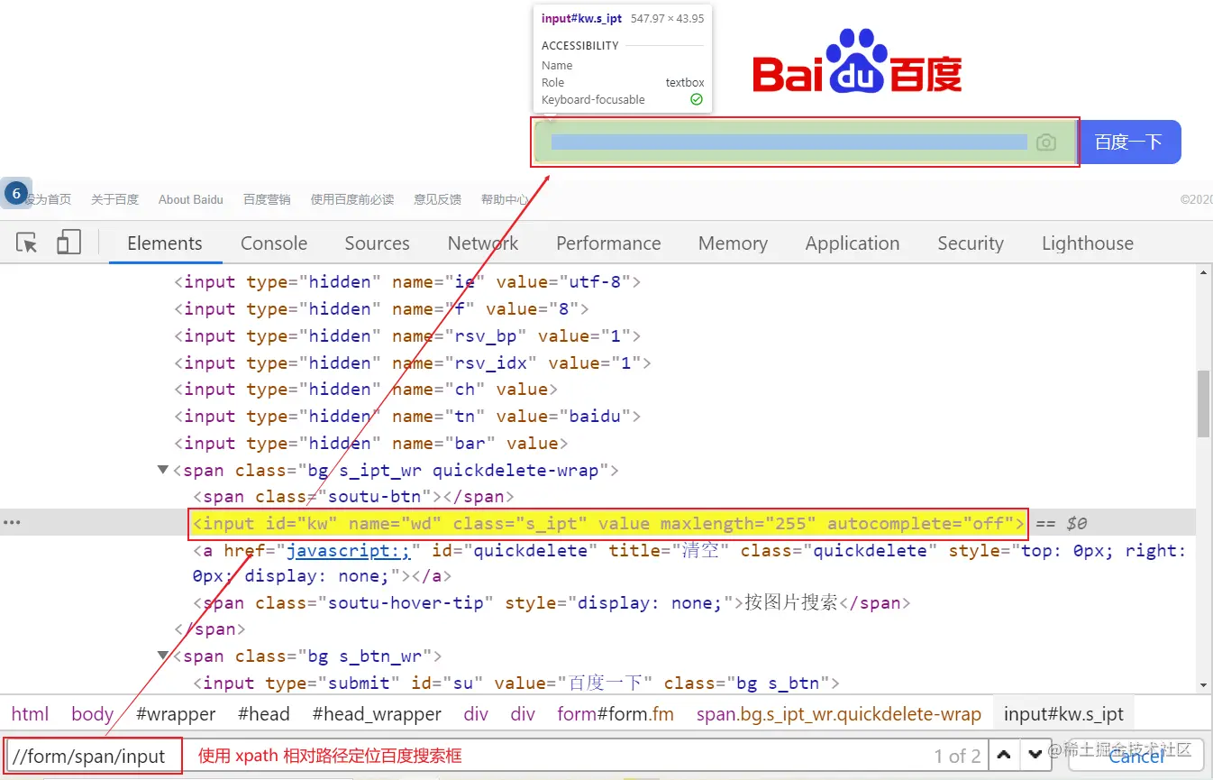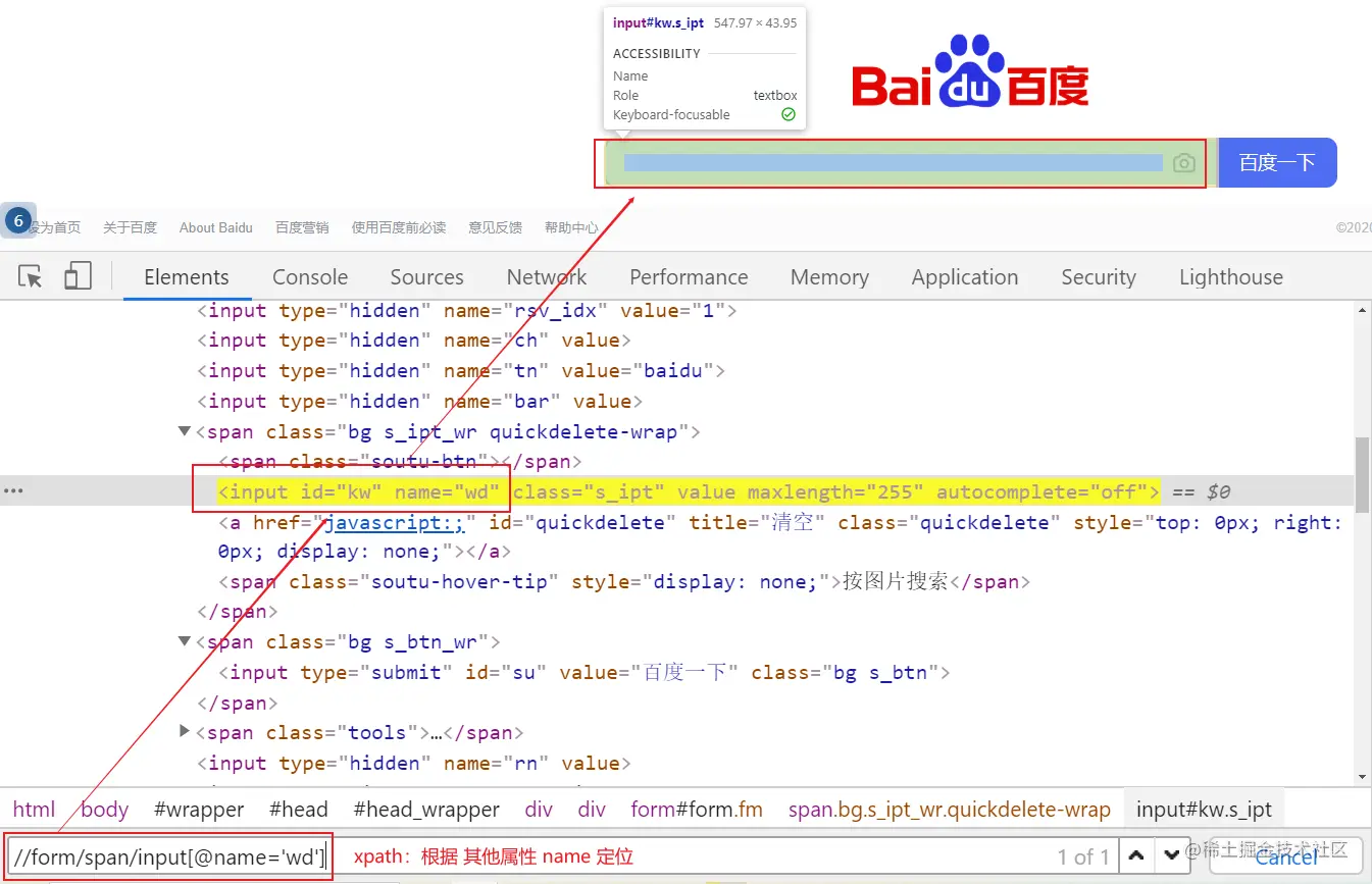 在上图中,定位百度首页的搜索输入框,通过 /html/body/div/div/div/div/div/form/span/input 最终定位到2个元素,因此最后需要使用下标的方式,达到唯一定位的作用。